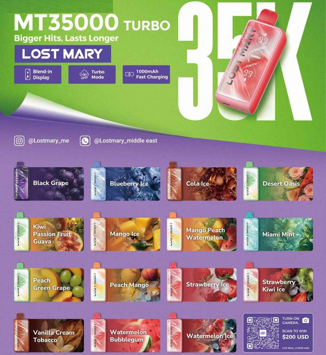 The LOST MARY MT35000 Turbo offers over 15 premium flavors, catering to a wide variety of taste preferences. Each flavor is carefully crafted to deliver rich, true-to-taste vaping experiences. Popular options include: