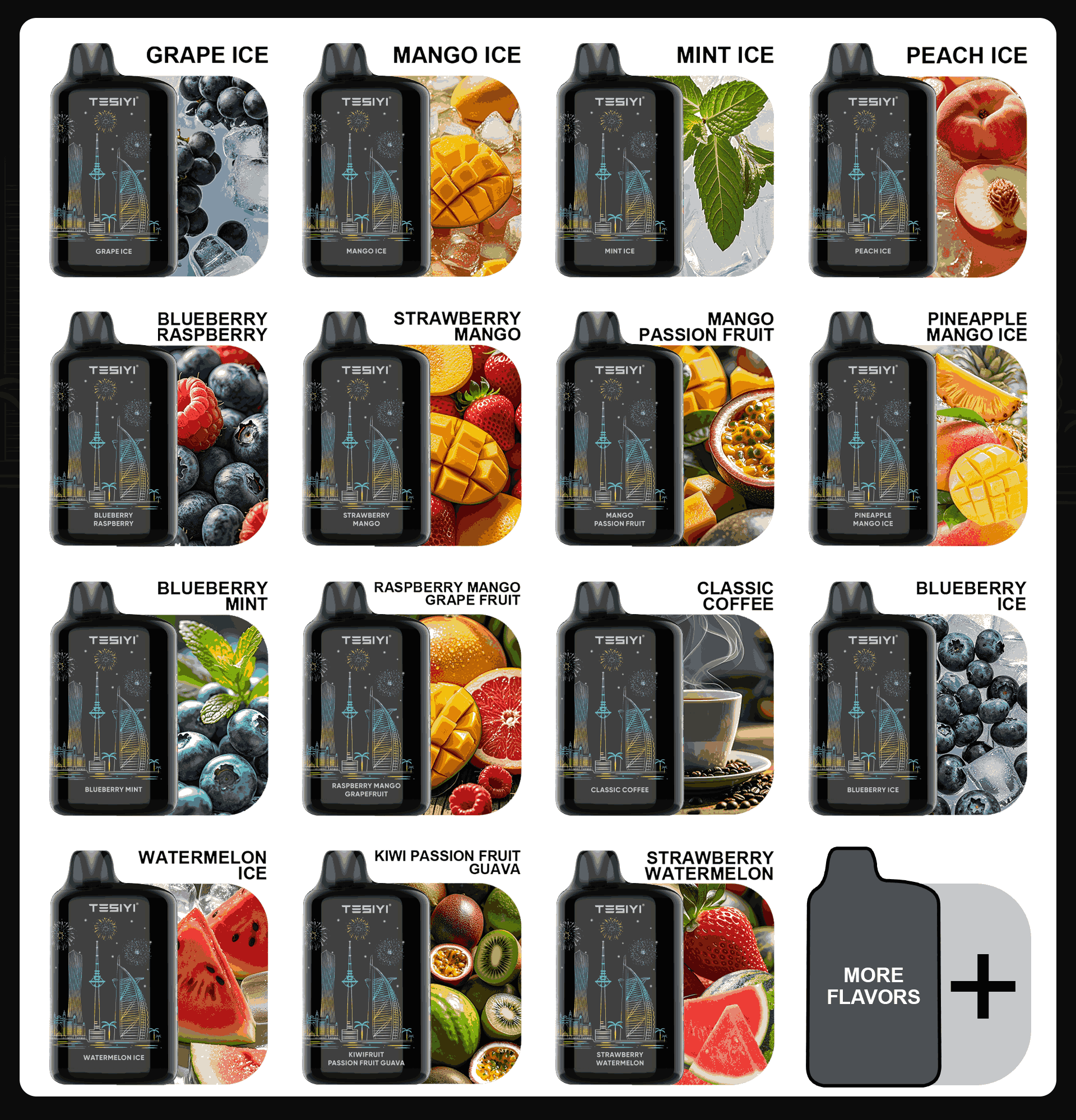 A6: It includes flavors like Grape Ice, Mint Ice, Mango Passion Fruit, Classic Coffee, and more.