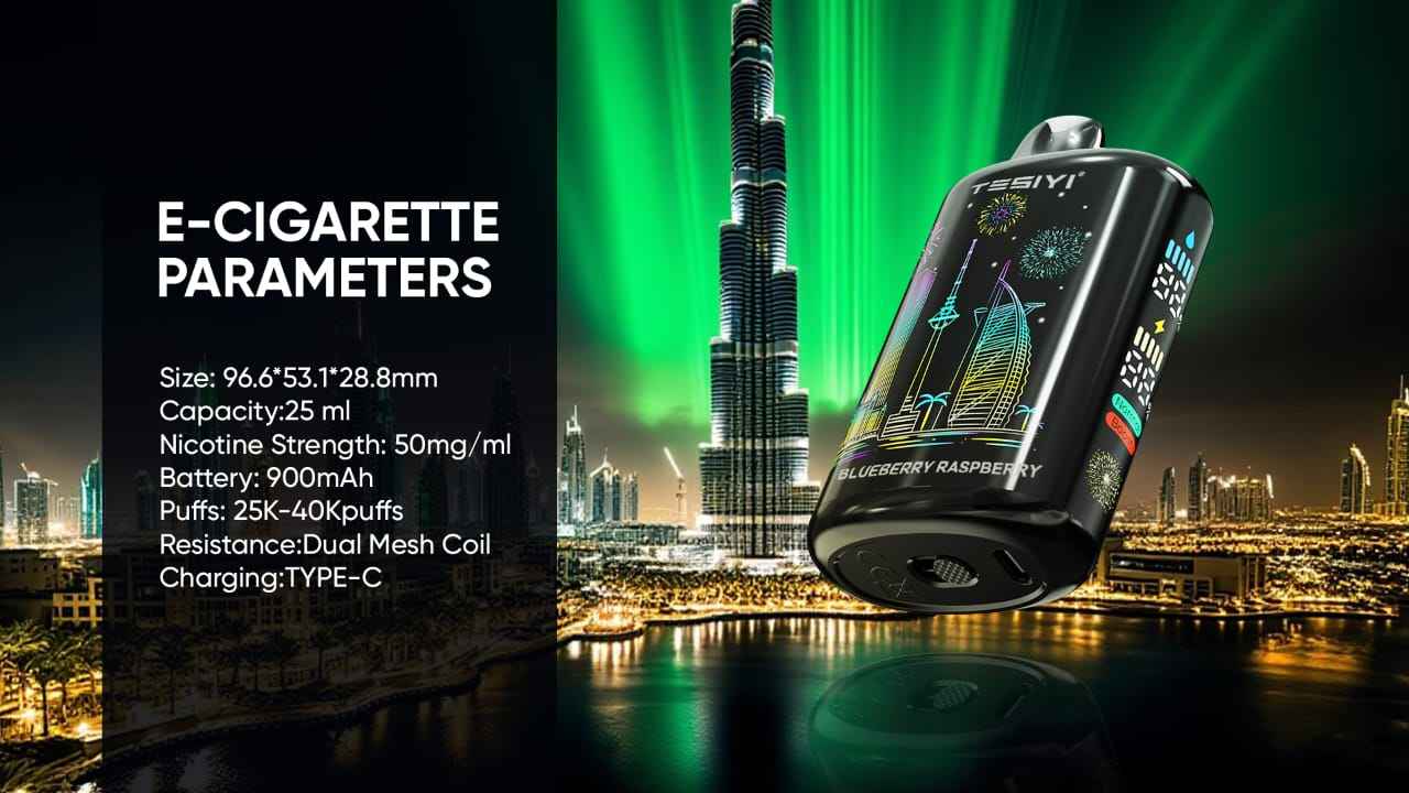 Featuring a Dual Mesh Coil, this device delivers consistent vapor, bold flavor, and smooth throat hits. With sleek Dubai-themed aesthetics and a vivid LED display, the TESIYI Ultra Max is the perfect blend of performance and style.